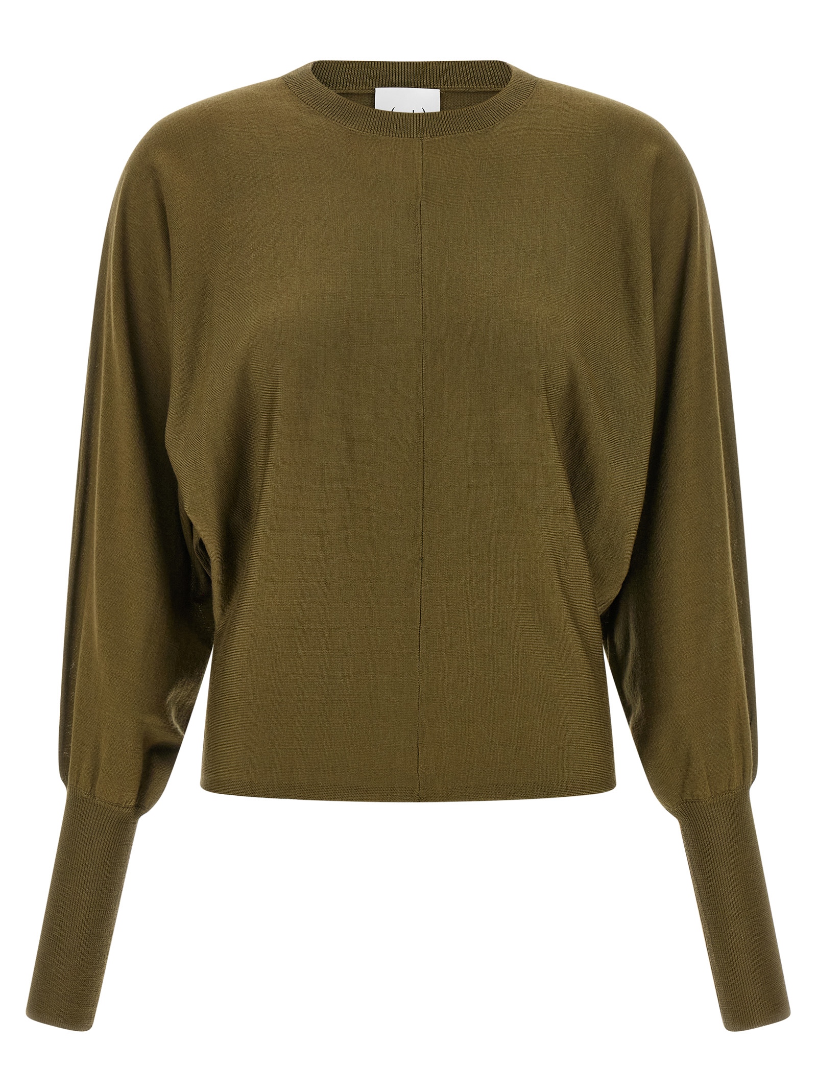 Wool, crewneck sweater with long wide bat sleeves with cuffs.