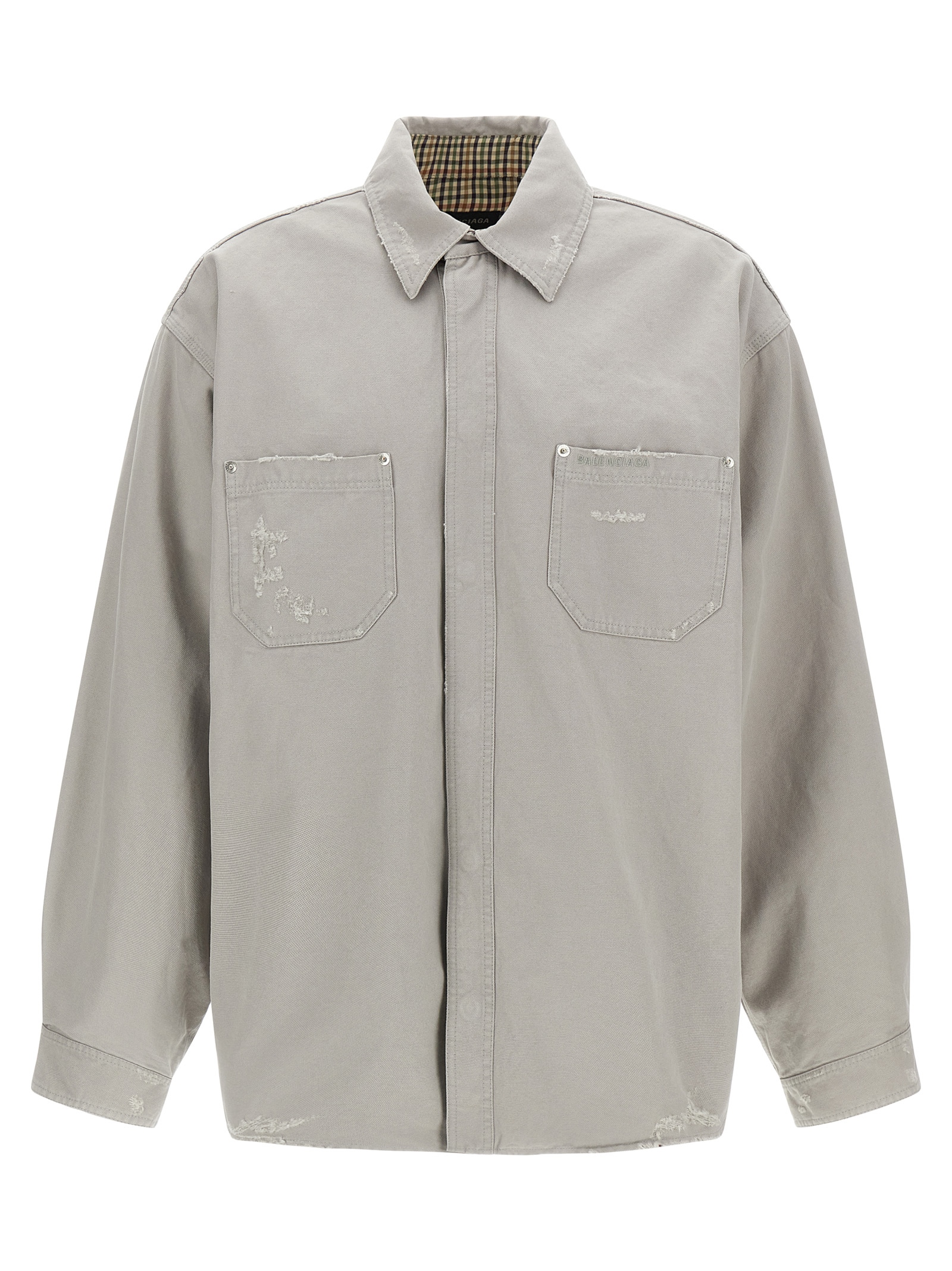 ‘Workwear’ overshirt in heavy used-effect cotton canvas, contrasting patterned cotton lining, tone-on-tone logo embroidery and front snap button closure, pockets, long sleeves with cuffs and dropped shoulders.