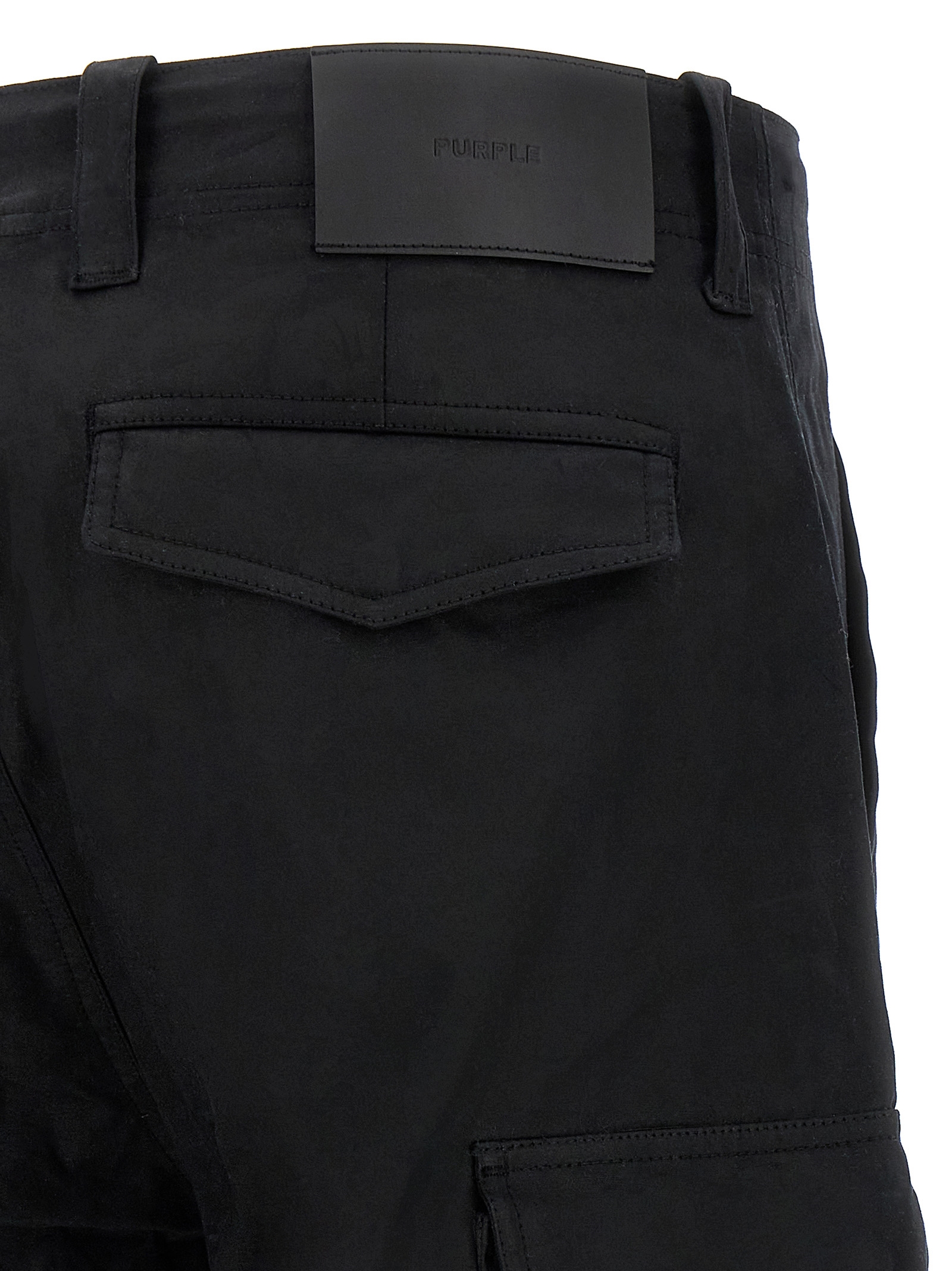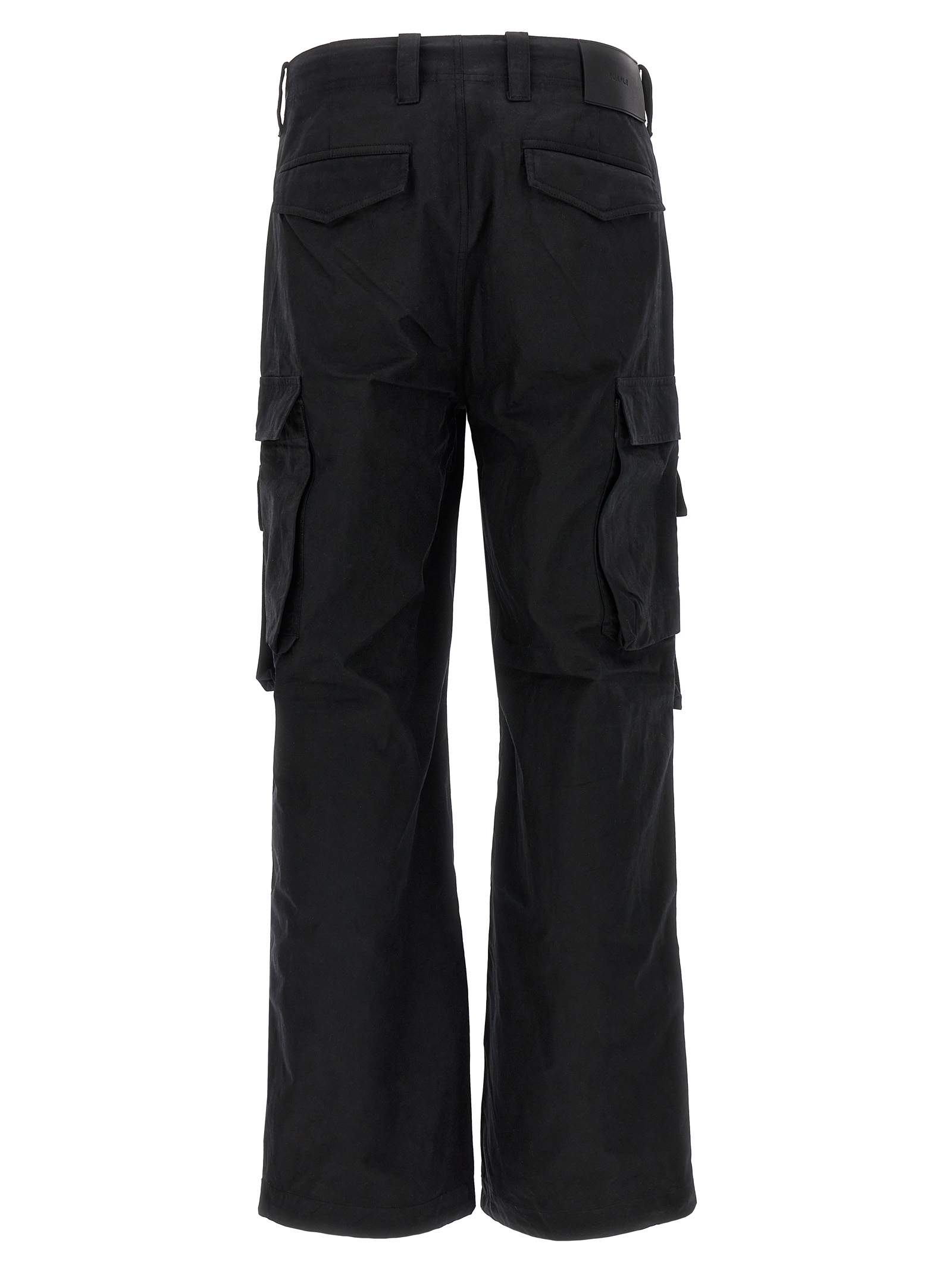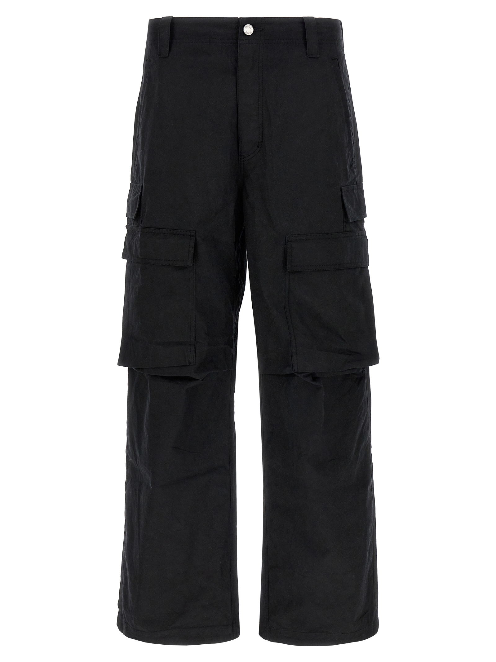 ‘Woven Cargo’ waxed cotton trousers, wide leg, button closure, pockets.