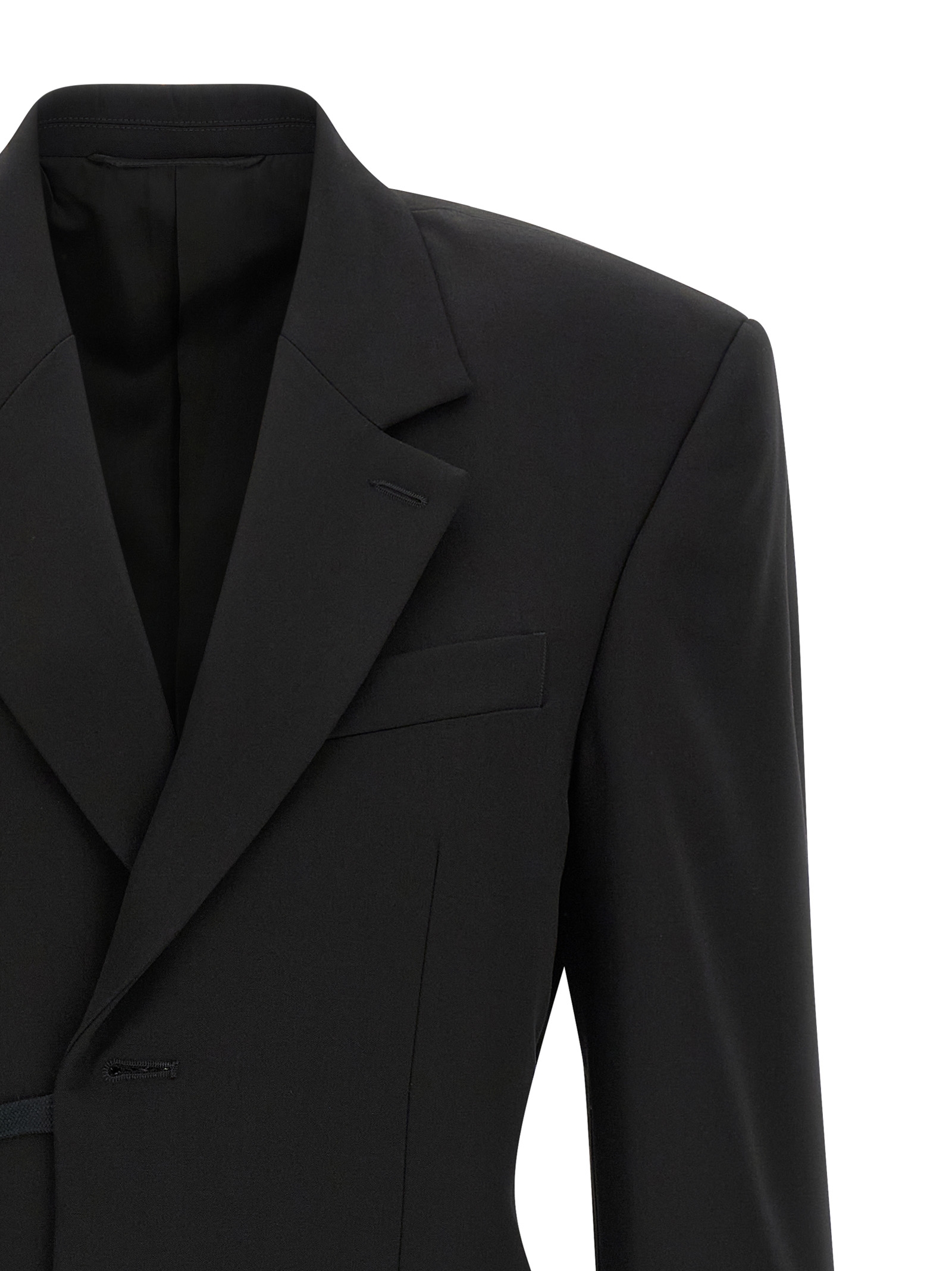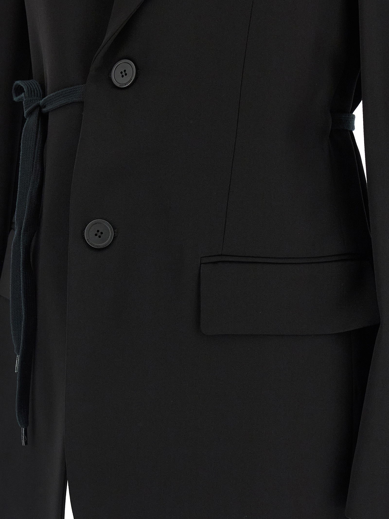 Wrap Tailored’ single-breasted wool blazer with front button closure, wallet construction with drawstring at the waist, mirror lapels, breast pocket, flap pockets, structured shoulder strap, long sleeves, back split, cupro lining.