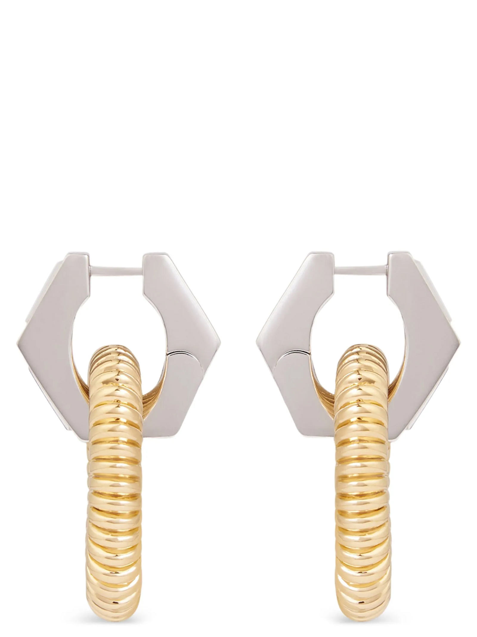 ‘XL Link’ earrings composed of a silver rhinestone mesh woven with a textured gold mesh, butterfly closure. Removable golden part.