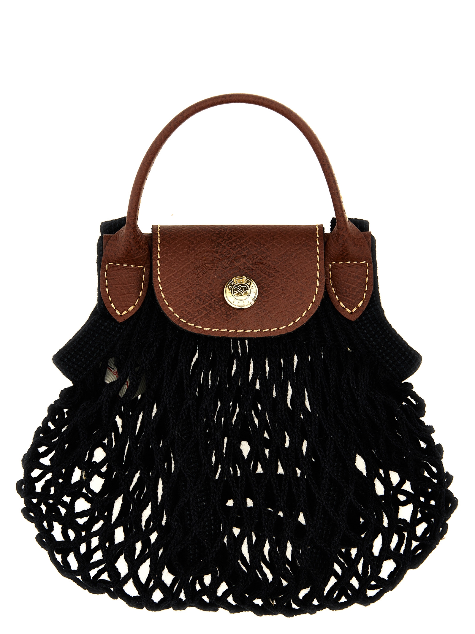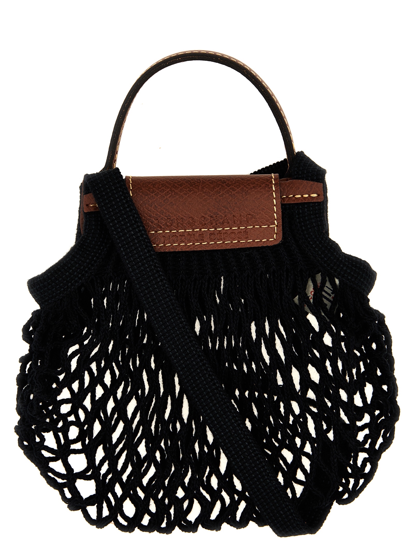 in cotton mesh, leather handle, leather flap with snap button closure and embossed logo, shoulder strap.