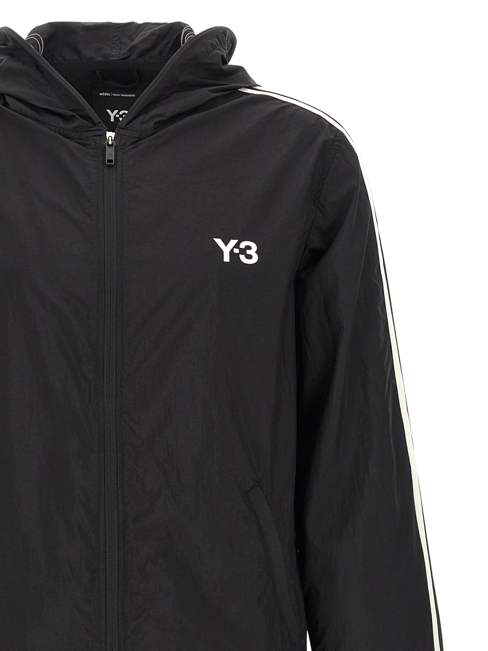 Tech fabric hoodie with ‘Y-3’ logo print and front zip closure, pockets, long sleeves with iconic 3 contrast stripes and wire on the sleeve hem, drawstring on the hem, unlined.