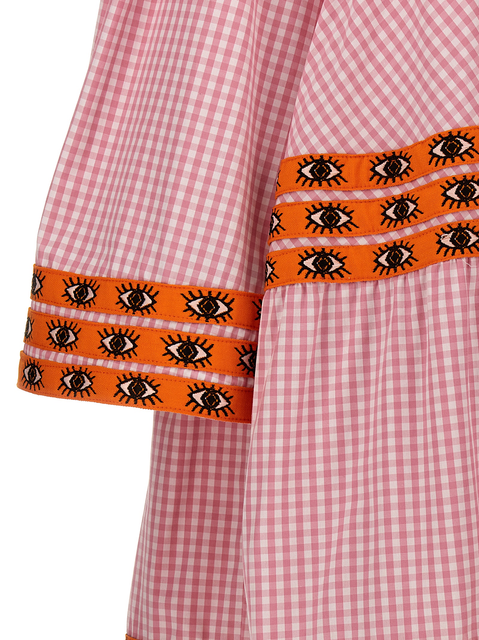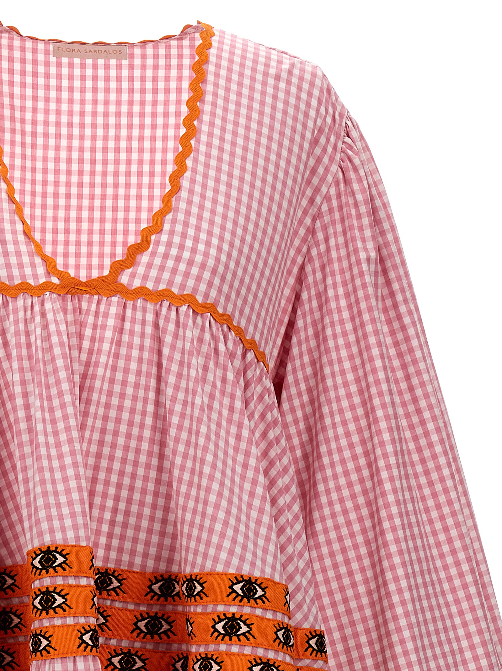 Vichy print cotton maxi Ydra dress, V-neck with contrast trimmings, wide and long sleeves, embroidered trimmings.