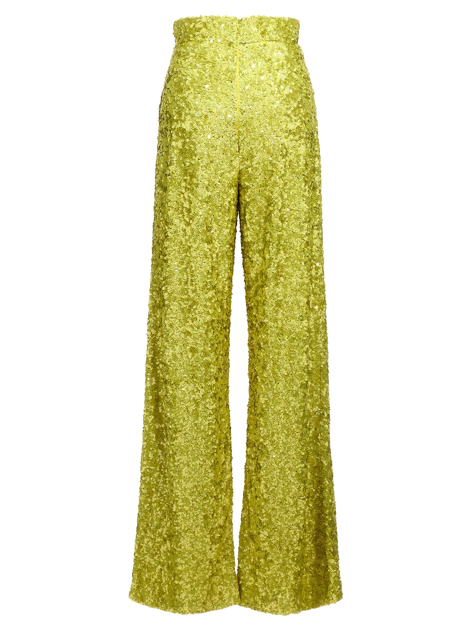 ‘Yot’ pants with all-over sequin appliqué, back zip closure, flared leg.