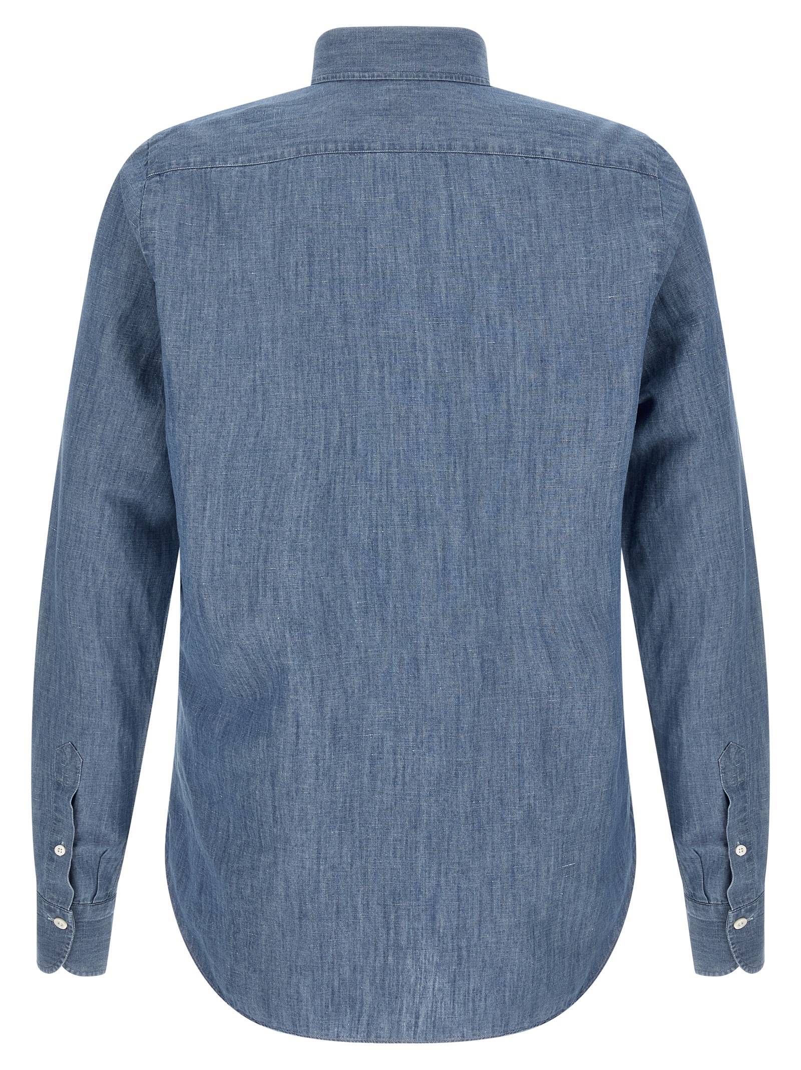 ‘Zurigo’ cotton and linen blend mélange shirt, button-down model with ‘Leonardo’ collar, front mother-of-pearl button closure, pockets, long sleeves with rounded cuffs, rounded head with contrast satin logo detail on the side vents.